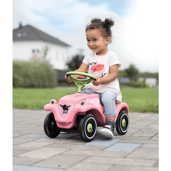 Door zijn zachtroze kleur in verbinding met een pastelgroen stuur en velgen en in de combinatie met het bloemendesign beotvert deze BIG bobby car niet alleen meisjes met tijdloze elegantie.