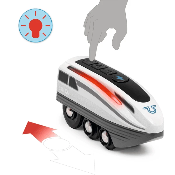 - Druk gewoon op de grote turboknop en deze speelgoedtreinlocomotief op batterijen verdubbelt zijn snelheid.