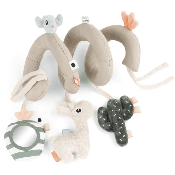 Met de zachte riemen is hij gemakkelijk te bevestigen aan het kinderbedje, de autostoel, de kinderwagen of de buggy. Laat uw kleintje naar de knuffel Lalee grijpen en het leuke knispergeluid ontdekken. Ook met de schattige cactus en het spiegeltje dat een grappig geluidje maakt, zal het onderweg nooit saai worden. Kleine Birdee kijkt toe van boven.