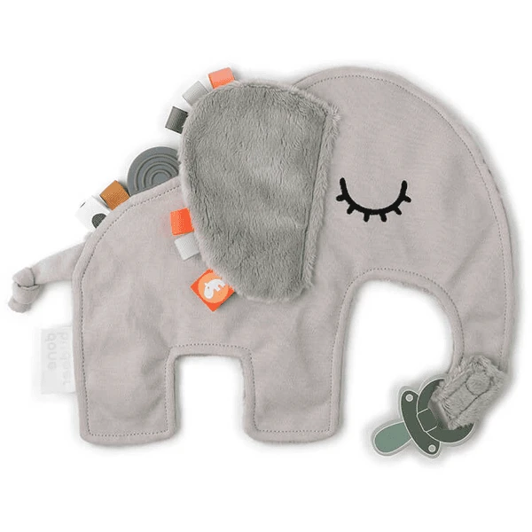 De zachte siliconen bijtring stimuleert en kalmeert jeukend tandvlees. De schattige olifant houdt fopspenen bij de hand. Met de handige klittenbandsluiting en elastische lus kunnen beide fopspenen met of zonder handvatten worden bevestigd.