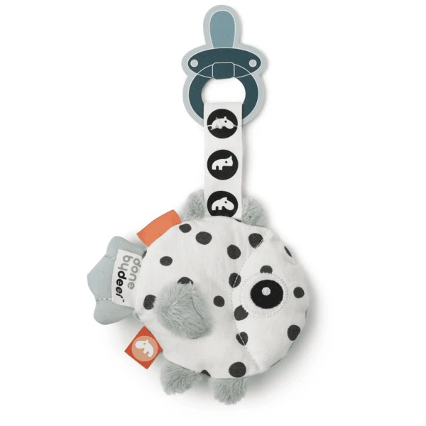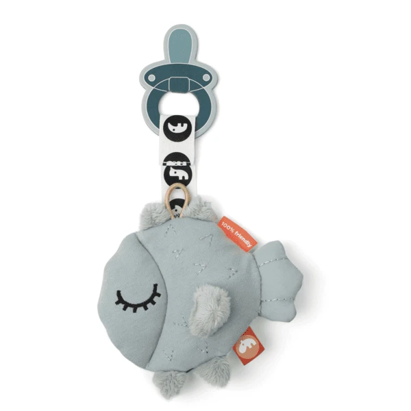 De fopspeenhouder heeft een praktische klittenbandsluiting en een elastische lus waaraan fopspeen met en zonder handvat kunnen worden bevestigd. De slaperige kwal is uitgevoerd in een warm blauw met zwarte contrasterende stippen en kleurrijke etiketten.