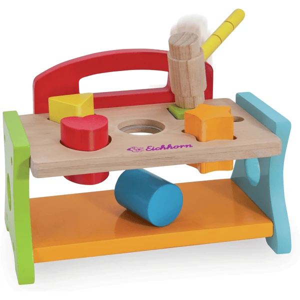 Met de hamer kunnen de afzonderlijke vormen door de respectievelijke gaten in de bank worden gehamerd. Met de hamerbank kunnen toekomstige ambachtslieden zich met plezier uitleven. Voor de productie van de Eichhorn hamerbank wordt alleen FSC® 100% hout uit duurzame tiger bosbouw gebruikt. Geschikt voor kinderen vanaf een jaar.