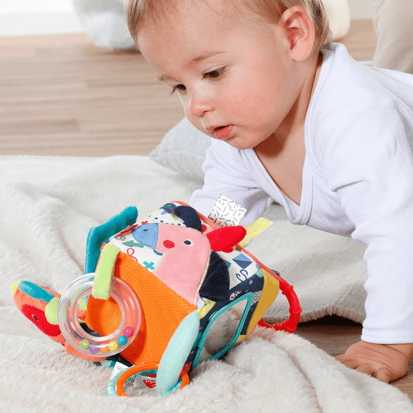 Motorisch speelgoed met grijpelementen om op te hangen voor de ontwikkeling van baby’s in de vroege kinderjaren – leerblokjes voor baby’s & peuters vanaf 0+ maanden — Met het spannende leerspeelhuis uit de COLOR Friends collectie ontdekken baby’s spelenderwijs nieuwe dingen: kralenrammelaars, kleurrijke grijpringen, pieper, knisperend papier, spiegels en bellen bieden een verscheidenheid aan grijp-, aanraak- en speelmogelijkheden en bevorderen speels de aandacht en de hand-oogcoördinatie van baby’s. Thuis in de wieg of onderweg in de baby-autozitting en -wagen – dankzij de praktische C-ring kan het veelzijdige stoffen huisje overal gemakkelijk worden bevestigd, zodat het snel een trouwe metgezel van de baby wordt!