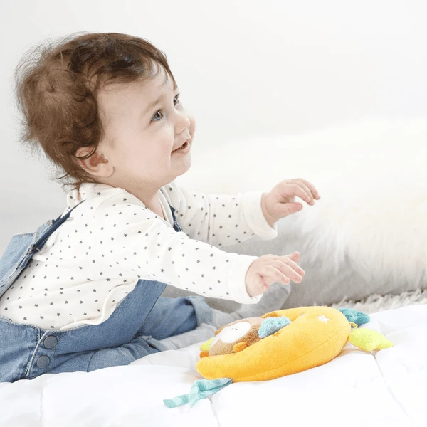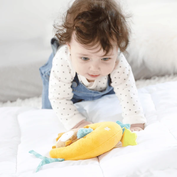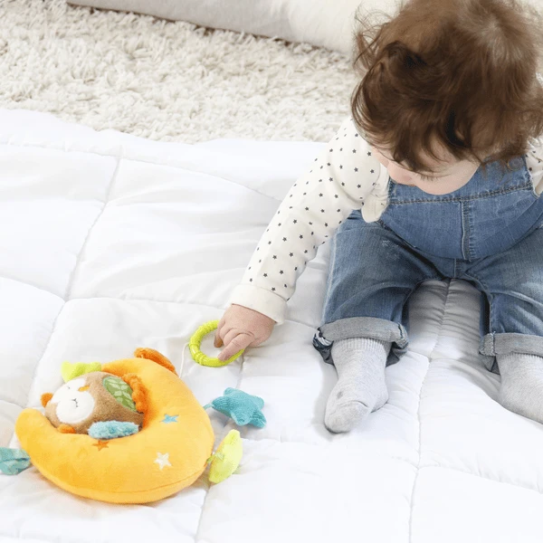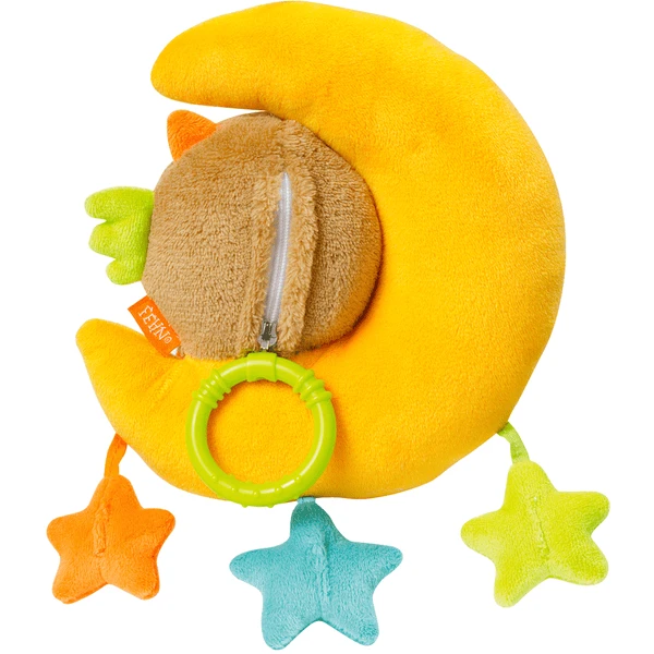 Het muziekdoosje Uil in maan is van zeer zacht en kleurrijke stof gemaakt. Dankzij de rustgevende melodie valt jouw baby in no time in slaap. Met uitneembaar muziekdoosje en ritssluiting.