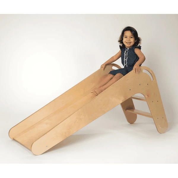 Elk detail is goed doordacht. Veiligheid heeft de hoogste prioriteit. De glijbaan is kantelbestendig en er zijn geen scherpe hoeken en randen waar de kleintjes zich kunnen verwonden. Twee treden, die zo zijn ontworpen dat het kind er met zijn hele voet op kan stappen, zorgen voor een aangename klim en afdaling. De ergonomische leuning maakt het voor kinderen gemakkelijker om het platform te beklimmen en geeft hen extra stabiliteit en veiligheid. Voor ouders maakt de leuning het gemakkelijk om de glijbaan van de ene naar de andere kamer te verplaatsen, of misschien zelfs de tuin in te gaan als het lekker droog is. Door het ca. 114 cm lange glijvlak met hoge zijwanden kunnen kinderen veilig naar beneden glijden, zodat niets het blije glijplezier in de weg staat.