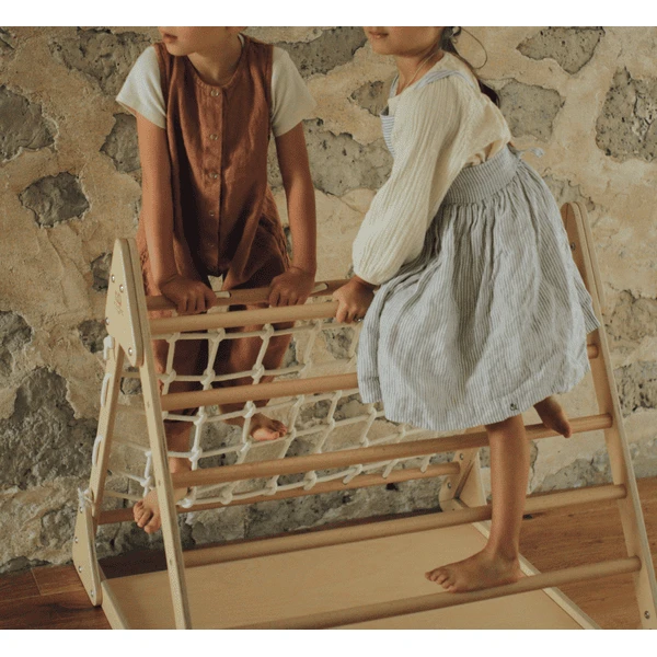 Deze drievoudige klimdriehoek heeft 3 verschillende kanten om te klimmen: een met touwen, een andere met houten stapblokken en een derde met deuvels. Gemaakt van verantwoord gewonnen berkenmultiplex en beukenhout is het een prachtige duurzame optie voor beweeglijke kinderen die hun avontuurlijke kant willen verkennen. Door fysiek ontwikkelingsspel met het Pikler systeem krijgen kinderen spier- en cardiovasculaire kracht, bouwen ze zelfvertrouwen op en verbeteren ze hun grove motoriek terwijl ze hun verbeelding verkennen.