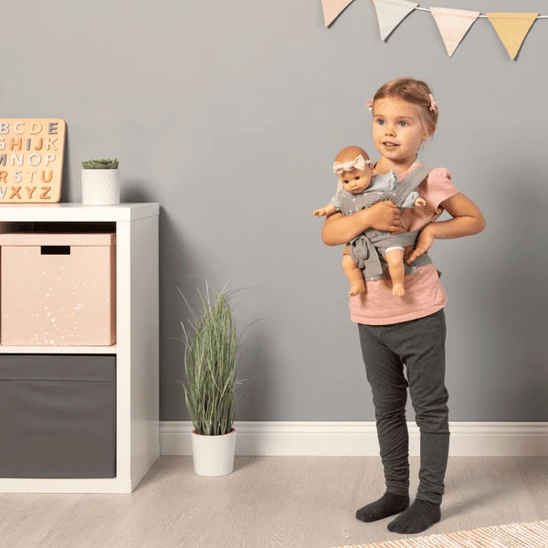 - Poppendrager met schouderbanden en buikband om vast te knopen (voor poppen/knuffeldieren tot ca. 38cm)