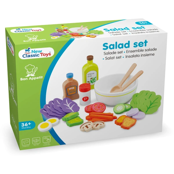 Met deze 26-delige slaset kunnen kinderen hun eigen kleine salade klaarmaken. Met het praktische schaaltje en de houten lepels kunnen ze het ook direct serveren. Met deze speelset maken kinderen spelenderwijs kennis met het keukenwerk.