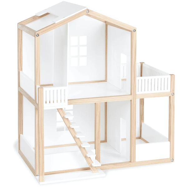 Het deels massieve poppenhuis biedt met twee verdiepingen, vier kamers, een balkon en een buitentrap veel mogelijkheden om het dagelijkse leven van de poppenfamilie steeds opnieuw vorm te geven.