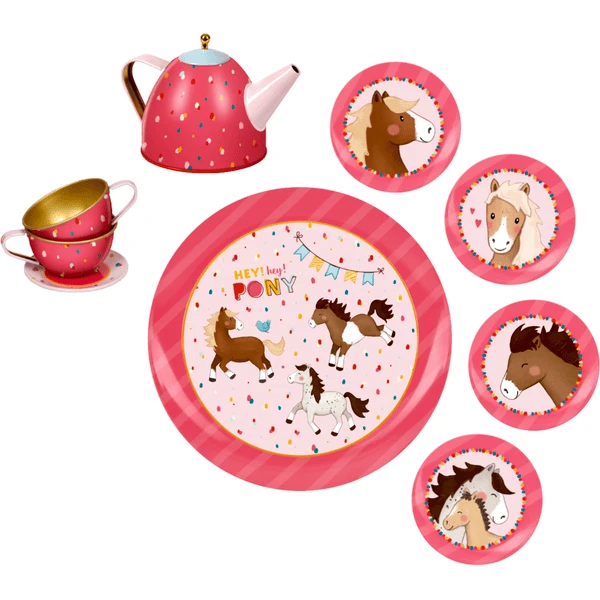 - De set bestaat uit vier kopjes, vier borden, een pot en een dienblad met magische ponymotieven en wordt geleverd in een liefdevol ontworpen omverpakking