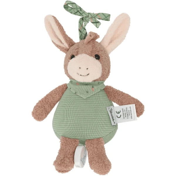 Het schattige ezeltje Emmilius gemaakt van pluizige stof en jersey met muziekdoosje zingt de baby in slaap. Met de riempjes is hij gemakkelijk te bevestigen aan het bedje, de kinderwagen of in de auto. Melody: The Sound of Silence.