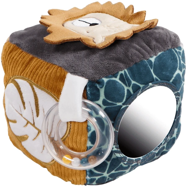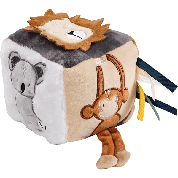 - De kubus bevat bijvoorbeeld een spiegel, losse poten van de aap, etiketten, een rammelaar en de manen van de leeuw kunnen worden vastgepakt.