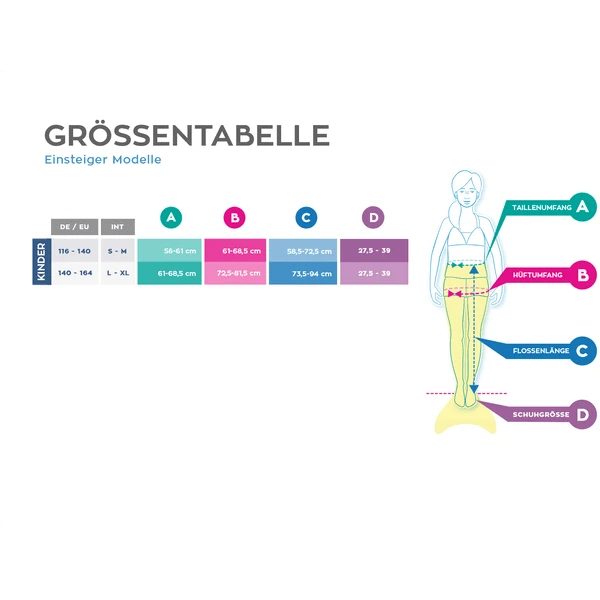 Aanbevolen voor kinderen vanaf 6 jaar die ervaren zwemmers zijn. Het Amerikaanse ontwerp heeft versterkte uiteinden (octrooi aangevraagd). De fishtail jersey is gemaakt van onderhoudsvriendelijk elastisch materiaal, machinewasbaar en zeer goed bestand tegen bleken, zout en chloor. Het open uiteinde maakt het mogelijk om water af te voeren en snel te drogen. De vin is gemakkelijk aan en uit te trekken. De monovin neopreen hoes komt uit de duiksport. De monovin wordt als een kous gedragen, zachte manchetten voorkomen drukpunten – er zijn geen bandjes of riemen! Hierdoor kan de monovin zich aanpassen aan de grootte van de voet.